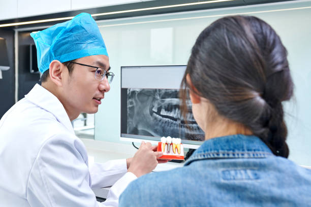 Side view of asian dentist and female patient discussing dental x-ray image and solution in dental’s office.